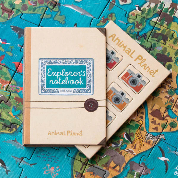 The puzzle includes an observation game. Once assembled. young adventurers can choose an expedition and take on the challenge of becoming zoologists. searching for and finding animal species to photograph them.