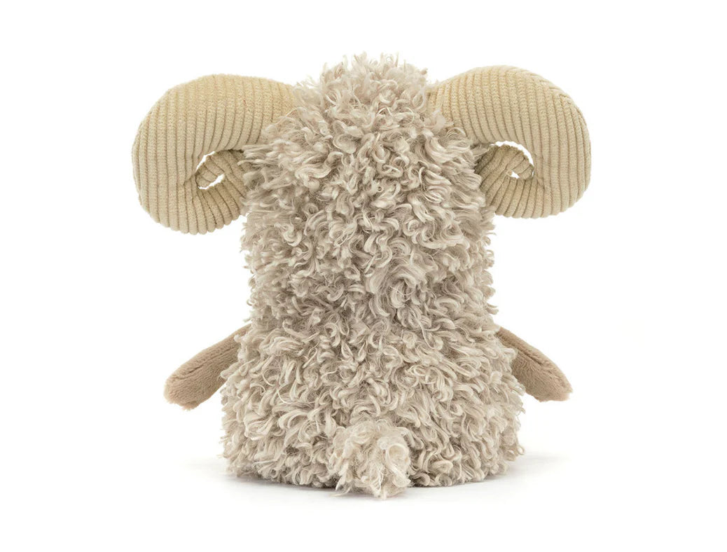 Jellycat Ramsley Sheep is the littlest bighorn in the herd. With a coat of tousled. textured beige fur and soft beige limbs with cloven hooves. Ramsley has an expressive face and large. curly cord horns. The perfect companion for any hiker or wanderer.