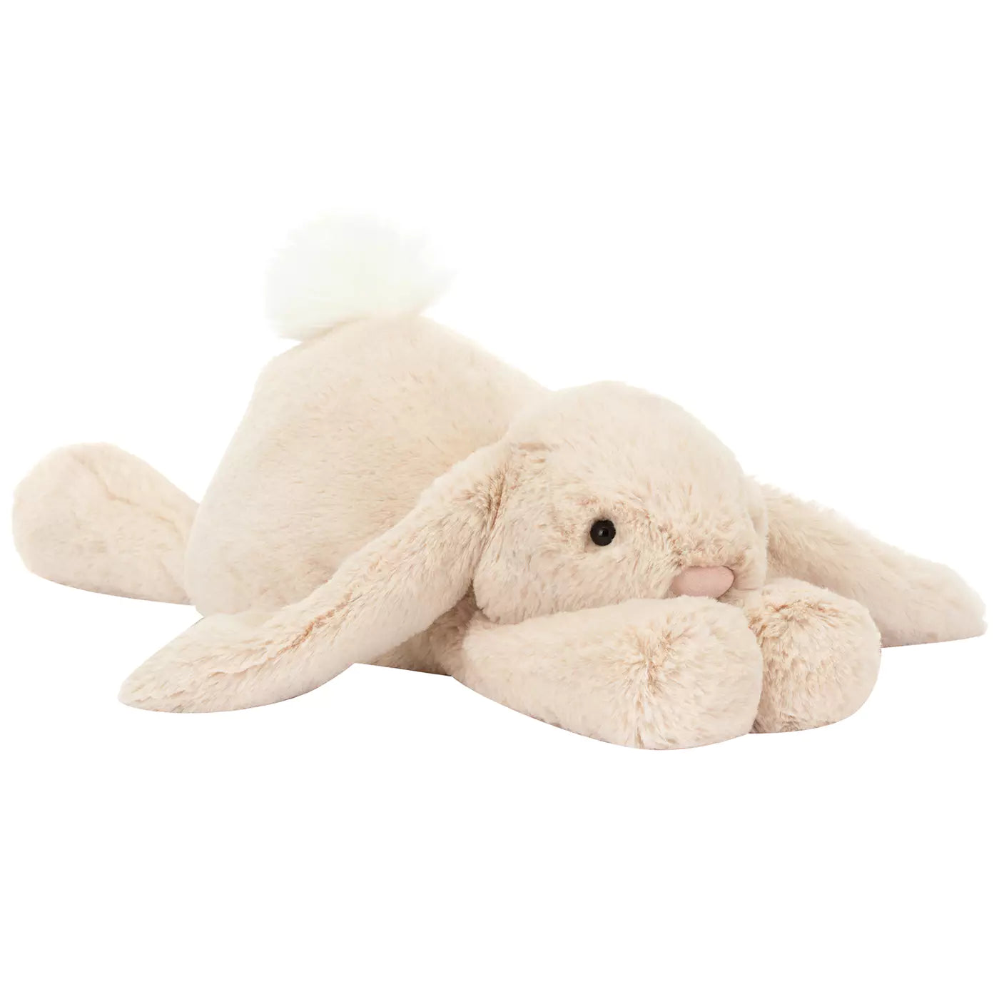 Jellycat Smudge Rabbit is such a sleepy sweetie – always sprawling out. lazing on the bed or rug! Scrumptiously soft in oatmeal fur. this lop-eared lazer just captures the heart. An incredibly lopsy and loving companion. Smudge is a great gift for any bouncing baby. Bonnets and bobtails – we like it!