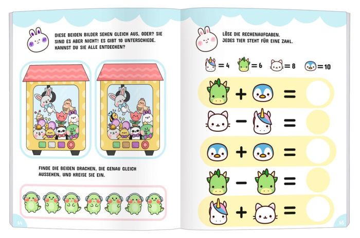 Together with cute animals. fantasy figures and other cuddly characters. this activity book (German language) is all about solving exciting arithmetic problems. crossing labyrinths. mastering tricky search games and cracking Sudoku puzzles. The colourful and cheerful design with bright colors and lovable characters puts you in a good mood and motivates you to tackle mathematical challenges in a playful way.