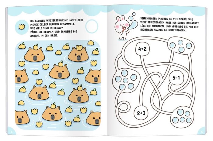 Each page is decorated with loving illustrations and is complemented by cute stickers that increase the fun factor even further. Whether to promote logical thinking or just for fun – Kawaii Cute Number and Arithmetic Fun makes children’s eyes shine.