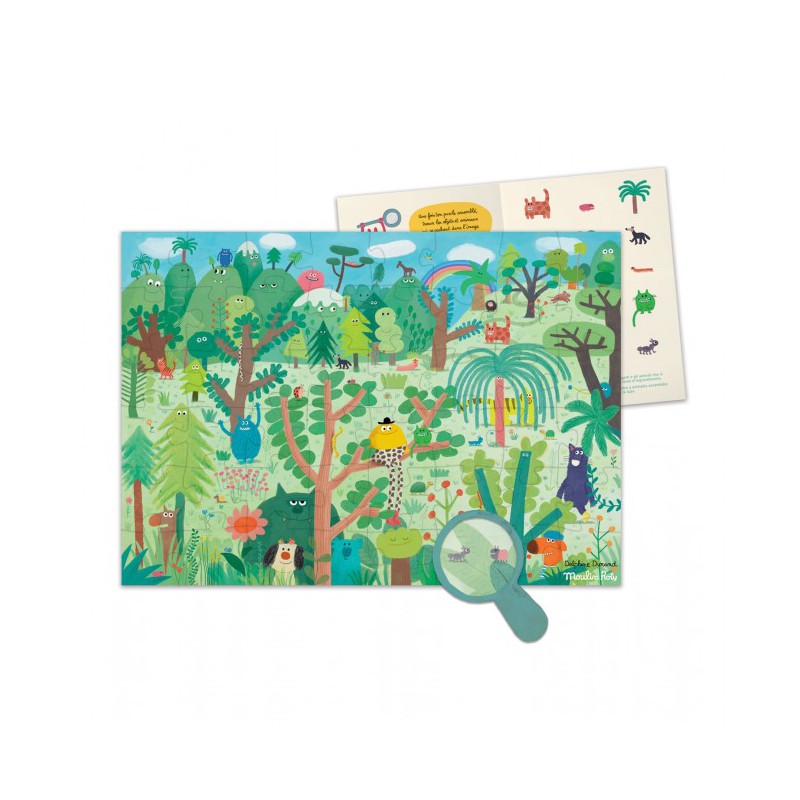 Observation puzzle 48 pcs. Colourful and graphic puzzle for children from 4 years of age. Use the included poster to help assemble your puzzle. Once assembled. use a magnifying glass to have fun finding the objects and animals hidden in the illustration by Delphine Durand.