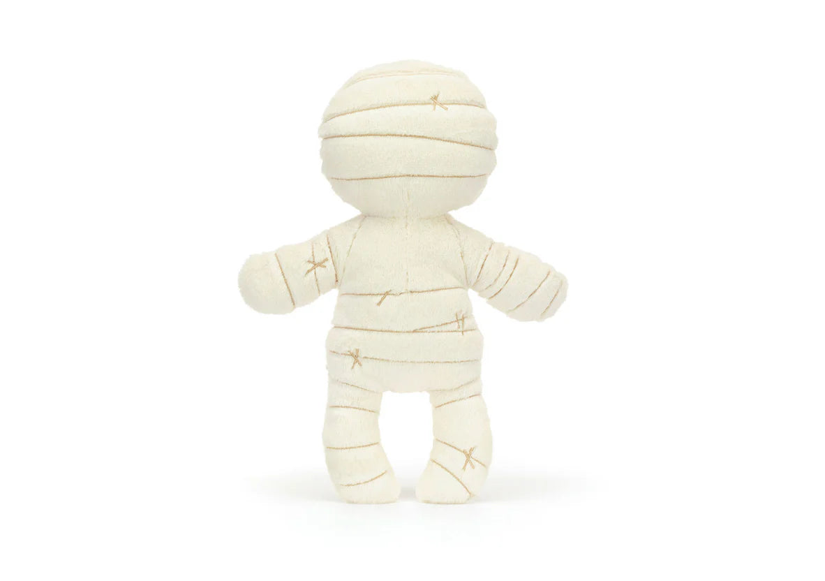 Even skeletons need Halloween costumes! Meet Mummy Bob – an undead softy in cream fur bandages. with delicate embroidered stitches. Look closely to see Bob’s shiny eyes peeking out from all those layers!