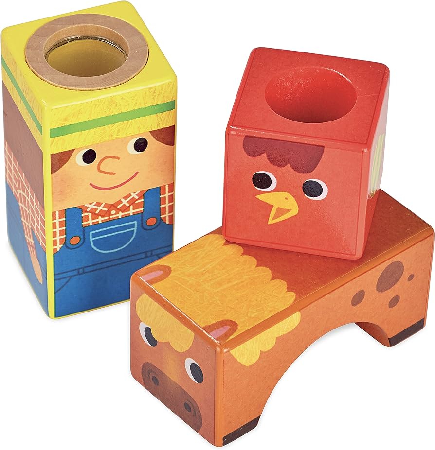 Add a musical addition to your playtime with these colourful wooden musical blocks for toddlers. The blocks each make sounds and are painted with farm themed animal designs. Build a tower with the blocks and hear the sounds they make as they come crashing down.
