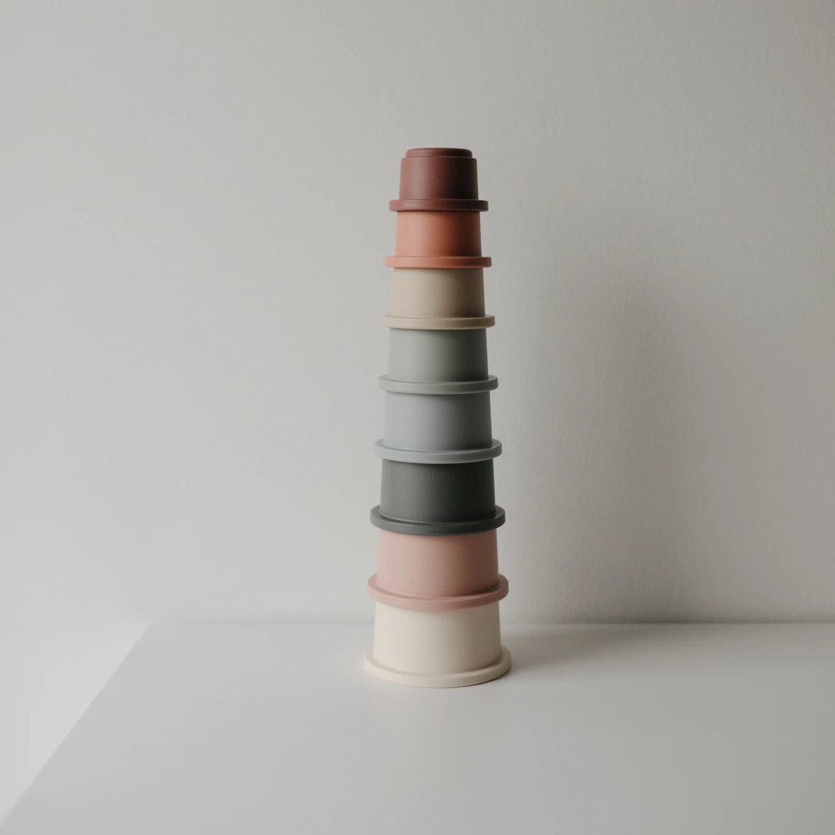 Playful. lightweight stacking toy in ”retro colour tones by Danish brand Mushie. These stacking cups are made of non-toxic and BPA-free silicone and are designed and manufactured in Denmark The set is part of the label’s Danish hygge collection. With the stacking cups. your child learns to grip. develop logical thinking and fine motor skills. Some of the cups feature small shaped holes in the bottom making them fun for use in the bath or in the sand making these stacking cups multifunctional.