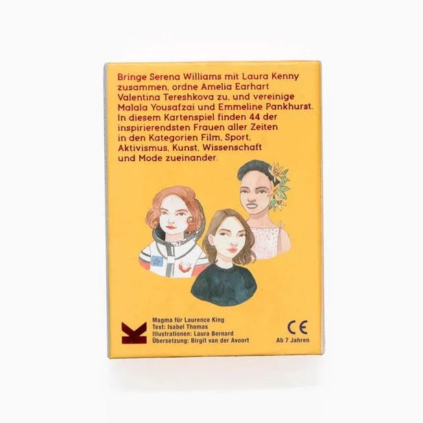 Card game (German language) featuring interesting and groundbreaking women throughout history up until today. Match Marie Curie with Ada Lovelace. match Toni Morrison with Jane Austen and unite Malala Yousafzai with Emmeline Pankhurst. In this card game. 44 inspiring super women find each other in the categories of film. sport. activism. art. science and fashion. The game comes with an accompanying booklet contains exciting short biographies of all the super women.