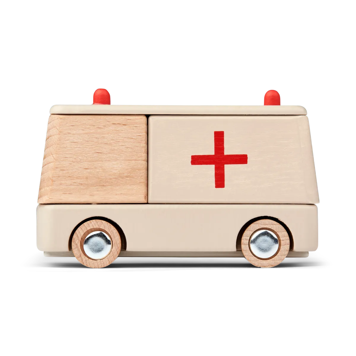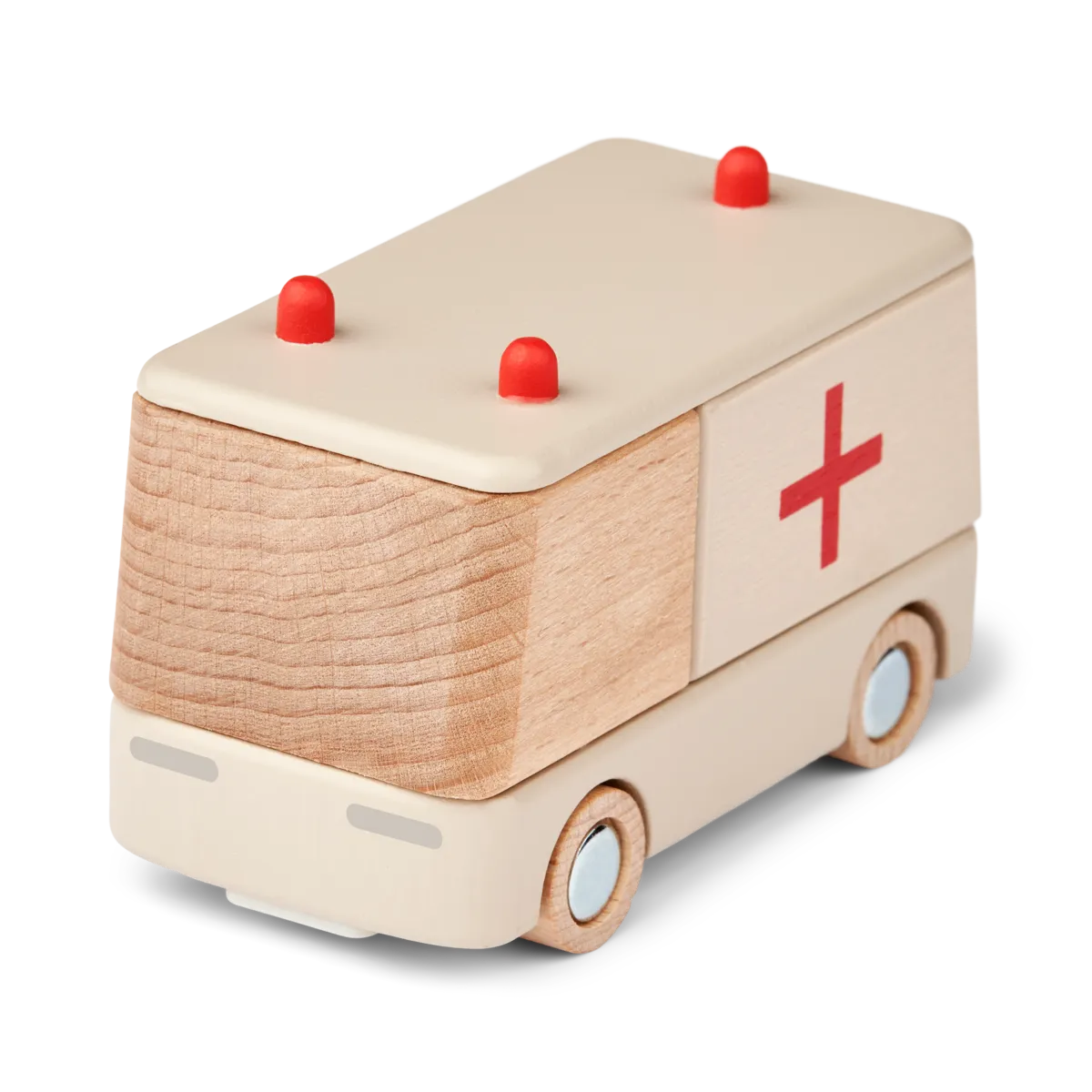 This ambulance made of beech wood and white lacquered MDF from Liewood goes well with other vehicles and the wooden garage. The frame is made of metal. Packed in a beautiful box it is a great gift idea. Perfect size for smaller hands.
