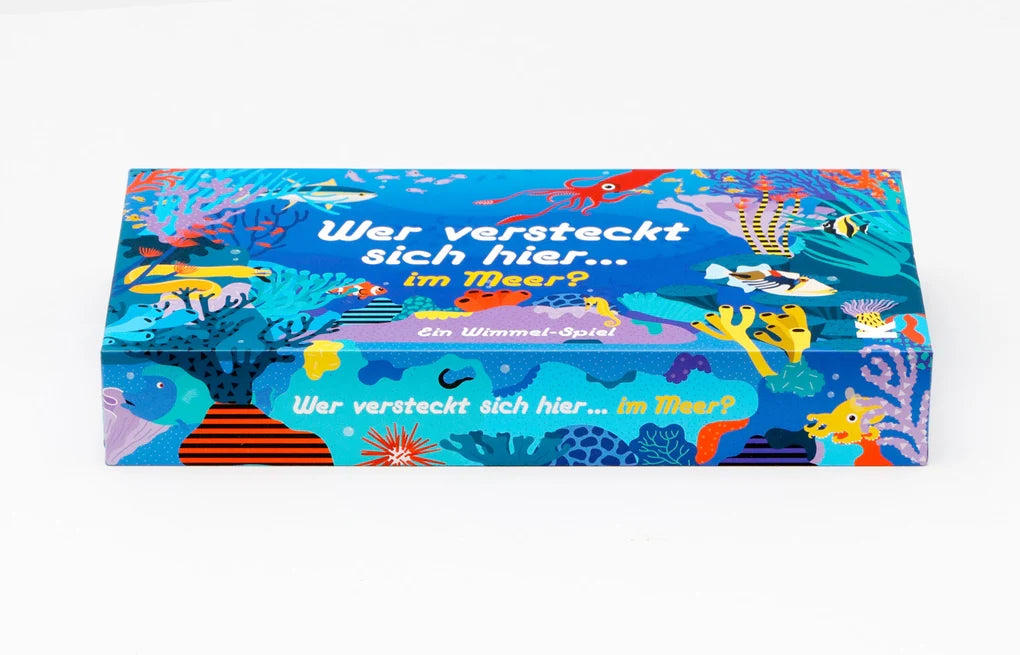 Dive into a fascinating underwater world! Who is hiding here in the sea? is a wonderful sea hidden object game: There are two types of cards – sea scenes and animal cards – and both are full of sea creatures. But there is only ever one animal that can be seen on both cards. Who will find it first and win?