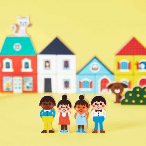 This set of City cubes and figures is part of our Cross Roads collection: a . made even more fun when complemented by our assortments of cubes and small wooden vehicles. This set is particularly suited to the City playmat. but can also be combined with other mats in the range. It’s made from FSC™-certified wood from sustainably managed forests. So. see you in front of the red house!